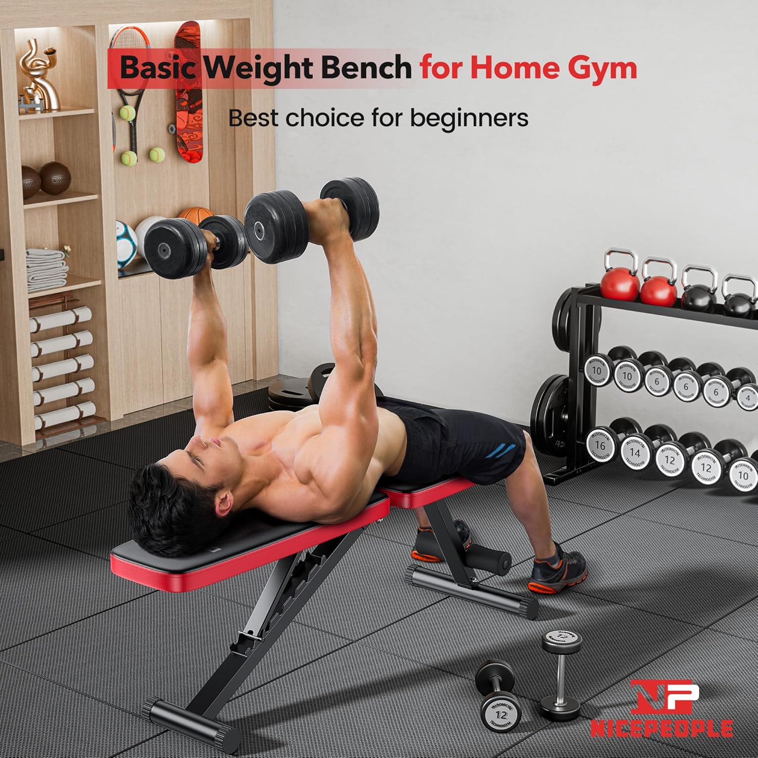 Great Choice for Home Gym: NICEPEOPLE Basic weight bench is an ideal pick for beginners with complete features; Easy to assemble and is compact to transform every corner into your home gym; Contact us to get an extra training guide and start bench workout