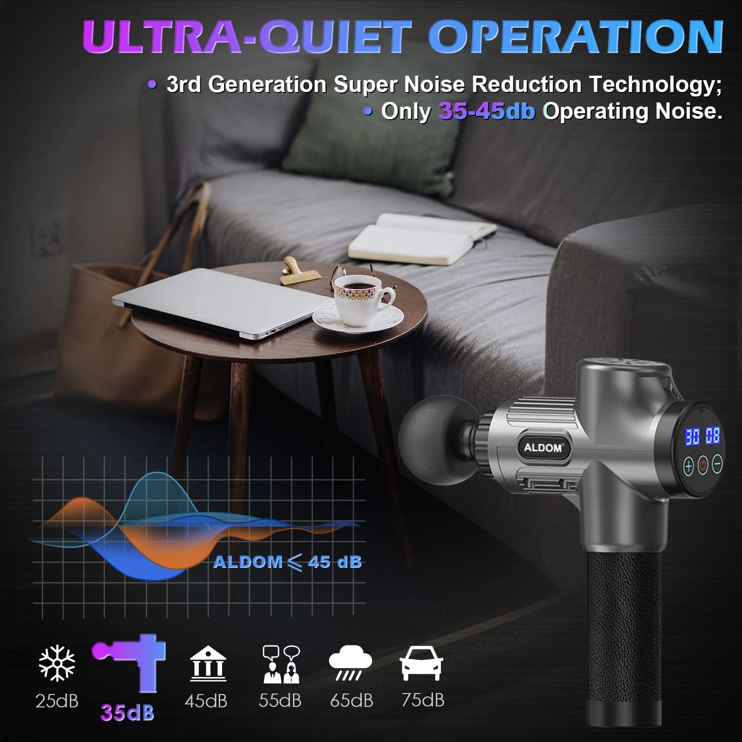 Professional Multifunctional Massage Gun : ALDOM Massage Gun is a body massager specially designed to relieve muscle tension, exercise recovery and treat deep tissue muscle pain.It helps us relieve muscle pain, soreness and stiffness by improving blood circulation, relieving lactic acid, thus relaxing the entire body and improving the overall health of the body’s soft tissues. Ideal for athletes, sedentary office users, seniors, fitness instructors and hikers