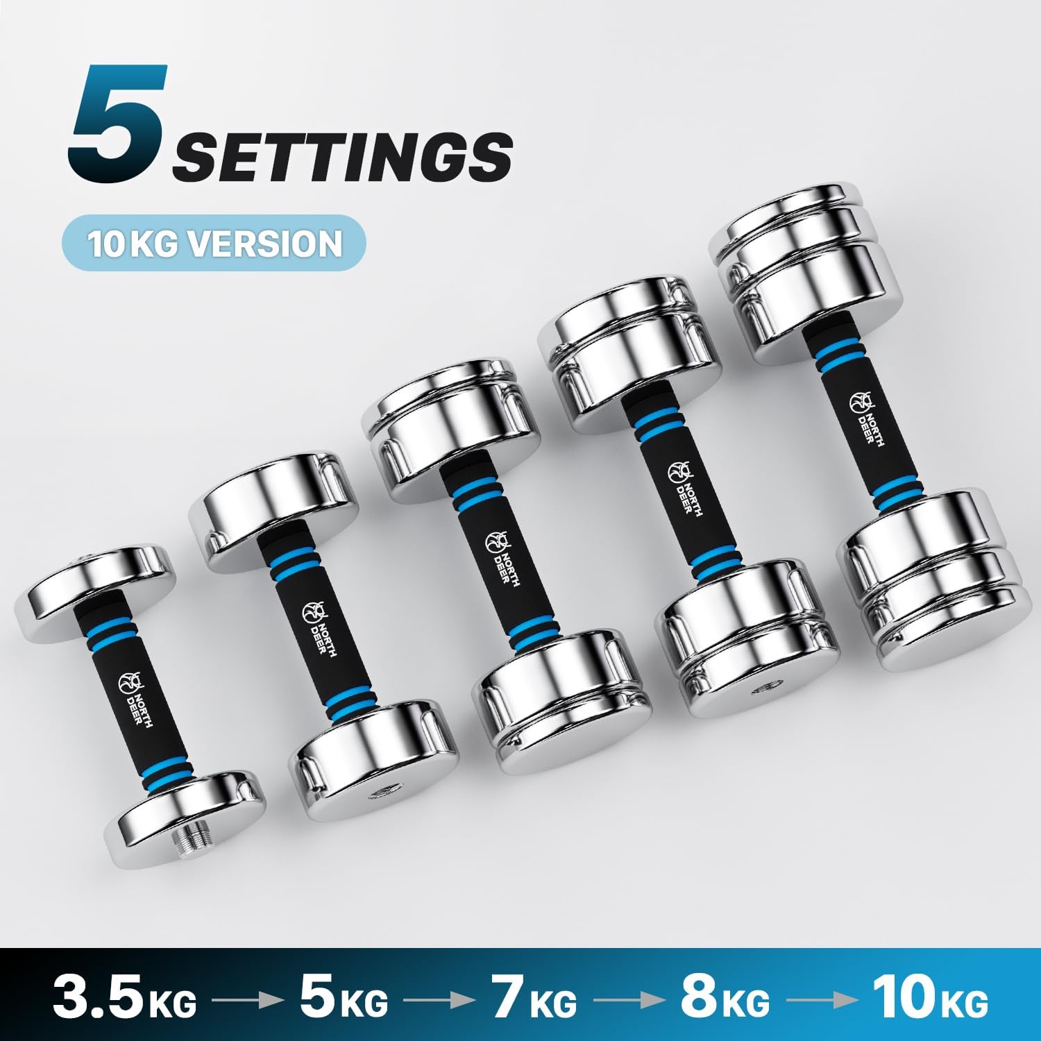 EASY WEIGHT ADJUSTMENT: With its no nut design, just unscrew the weight plates to quickly adjust the weight. Each 2.5kg dumbbell can be adjusted to 1kg, 1.5kg, 2kg, 2.5kg. Each 5kg dumbbell can be adjusted to 2kg, 2.5kg, 3.5kg, 4kg, 5kg. Each 7.5kg dumbbell can be adjusted to 3kg, 3.5kg, 5kg, 6kg, 7.5kg. Each 10kg dumbbell can be adjusted to 3.5kg, 5kg, 7kg, 8kg, 10kg. Each 15kg dumbbell can be adjusted to 5.5kg, 7kg, 10kg, 12kg, 15kg. Each 25kg dumbbell can be adjusted to 8.5kg, 12kg, 17kg, 20kg, 25kg.