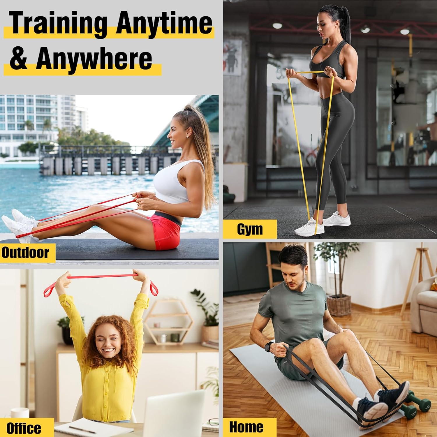 Exercise bands with 3 Resistance Levels: Resistance bands set men/women comes with 3 different colors and levels: Yellow 5-15 lb, Red 15-35 lb, Black 25-65 lb. Each loop measuring 208cm. You can gradually increase your resistance through training